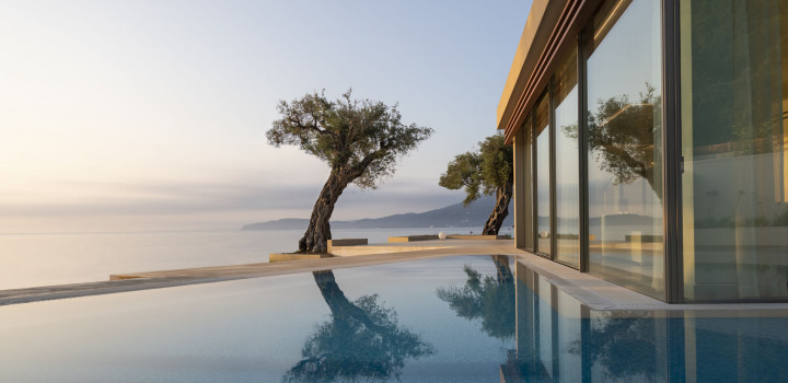 Across the bay, mainland Igoumenitsa and Pindos mountains reflect on to the lake-like cove, creating a multicolored spectacle throughout the day. Take a walk barefoot on the cooling lawn and arrive upon white – pearl marble steps that immerse you into the glassy Ionian sea, landscaped into a one of its kind natural swimming pool.