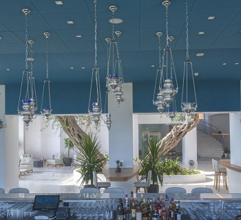 A tantalising selection of Mediterranean cuisine with bags of Greek flavour is the order of the day at the two onsite restaurants. The first spot is by the pool, serving buffet breakfasts and à la carte lunches, while the rooftop bar and restaurant opens its doors for dinner, offering a menu with an emphasis on net-fresh seafood. Evening tipples, meanwhile, are best enjoying the Library Bar, where you’ll find an impressive selection of wines and cocktails.